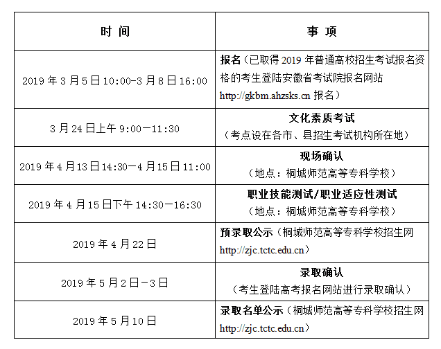 2019年4月22日前,在桐城师范高等专科学校招生网(http://zjc.tctc.edu.cn)公布被我校预录取考生信息,并公示一周。